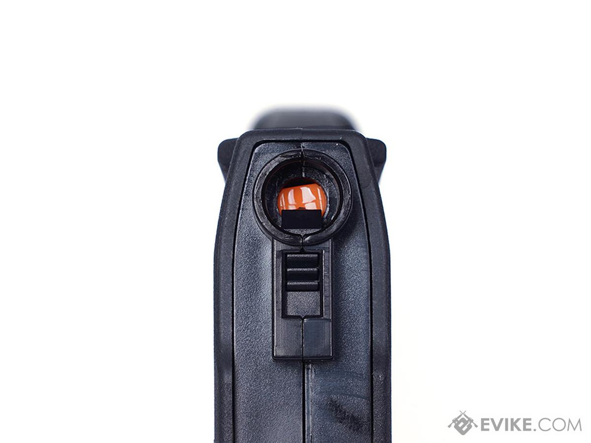 When the magazine is fully loaded, at the base of the see-through bullet window, an orange follower comes into view. This is a remarkable design feature unique to the EPM as it allows the end user to pick up any EPM magazine and immediately know if the magazine is filled to capacity and ready to go. It also acts a visual indicator for the user to known when to stop loading the magazine.