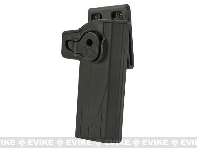 This holster is manufactured in collaboration of Matrix Tactical Systems and a manufacturing facility that produces real steel fire-arm holsters. The Matrix Group brings you an injection molded hard shell holster with trigger lock specifically designed for airsoft pistols using the same manufacturing process as real steel holsters. It is compatible with Tokyo Marui, WE-Tech, and most other similar Airsoft pistols as well as real firearms.