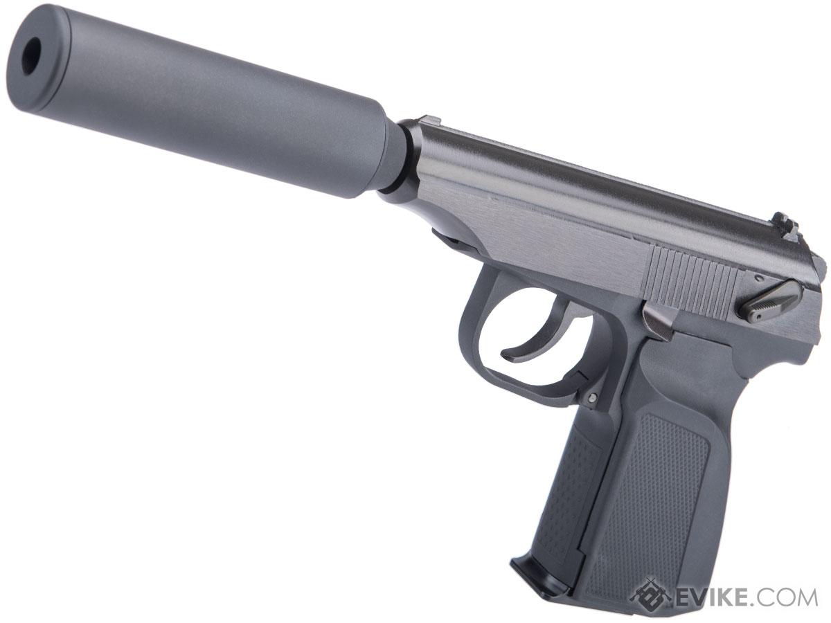 WE-Tech's Russian PMM is a full metal framed, polymer ergonomic gripped gas blowback airsoft pistol with realistic disassembly and crisp action. Included with the package is a removable mock suppressor and inner barrel extension that offers improved accuracy and measurable power differences over the stock orientation. Trigger actions provide both single and dual action modes while the slide boasts the integrated safety switch. The lower grip mounted magazine release and lanyard attachment loop stays true to the real thing.