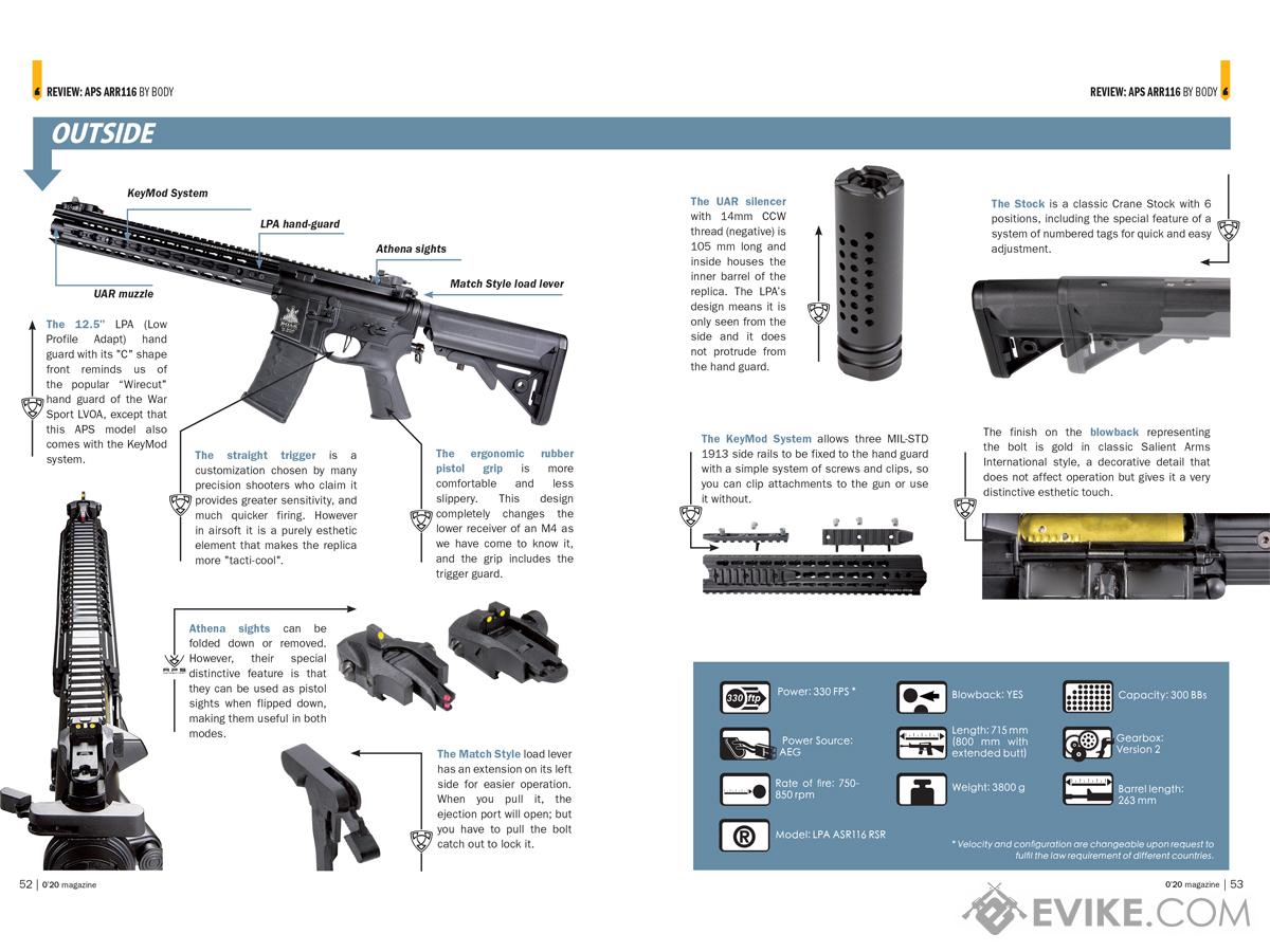 The APS low profile adapt rail system EBB AEG is a feature packed Airsoft M4 AEG that comes pre-customized with the latest and greatest in accessories and technology. Designed to be streamlined and high speed, this rifle features great ergonomics making it very comfortable to wield. The one piece polymer motor grip and trigger guard is ergonomically designed to increase operator comfort and is equipped with an ambidextrous QD sling mount at the rear of the grip. The front hand guard features Keymod mounting brackets for use with most Airsoft-spec Keymod accessories.