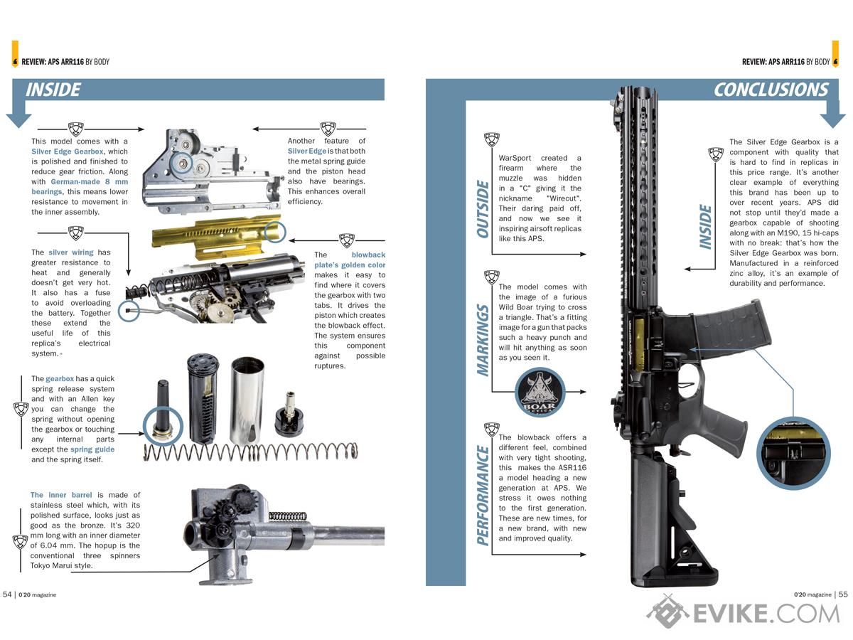 The APS Silver Edge gearbox is yet another step forward with improvement of the tried-and-true version 2 gearbox. APS took their Hybrid Electric Blowback gearbox design and improved upon it with some excellent key features. First and foremost they use an improved strength zinc alloy for the gearbox shell material. They then fully polish the interior of the gearbox to a chrome-like finish, effectively reducing friction on the moving parts that contact the gearbox walls, such as the sides of the piston and the tappet plate. From there they deck the gearbox out with steel gears riding on 8mm stainless steel bearings, low-resistance wiring and trigger switch, and to top it all off a Quick-Change ball bearing spring guide allowing for easy spring changes in the future. All of these improvements net around a 15% increase in overall efficiency, when compared with standard Ver2 gearbox designs. What this means for the user is better battery life, smoother gearbox performance, and improved gearbox longevity.