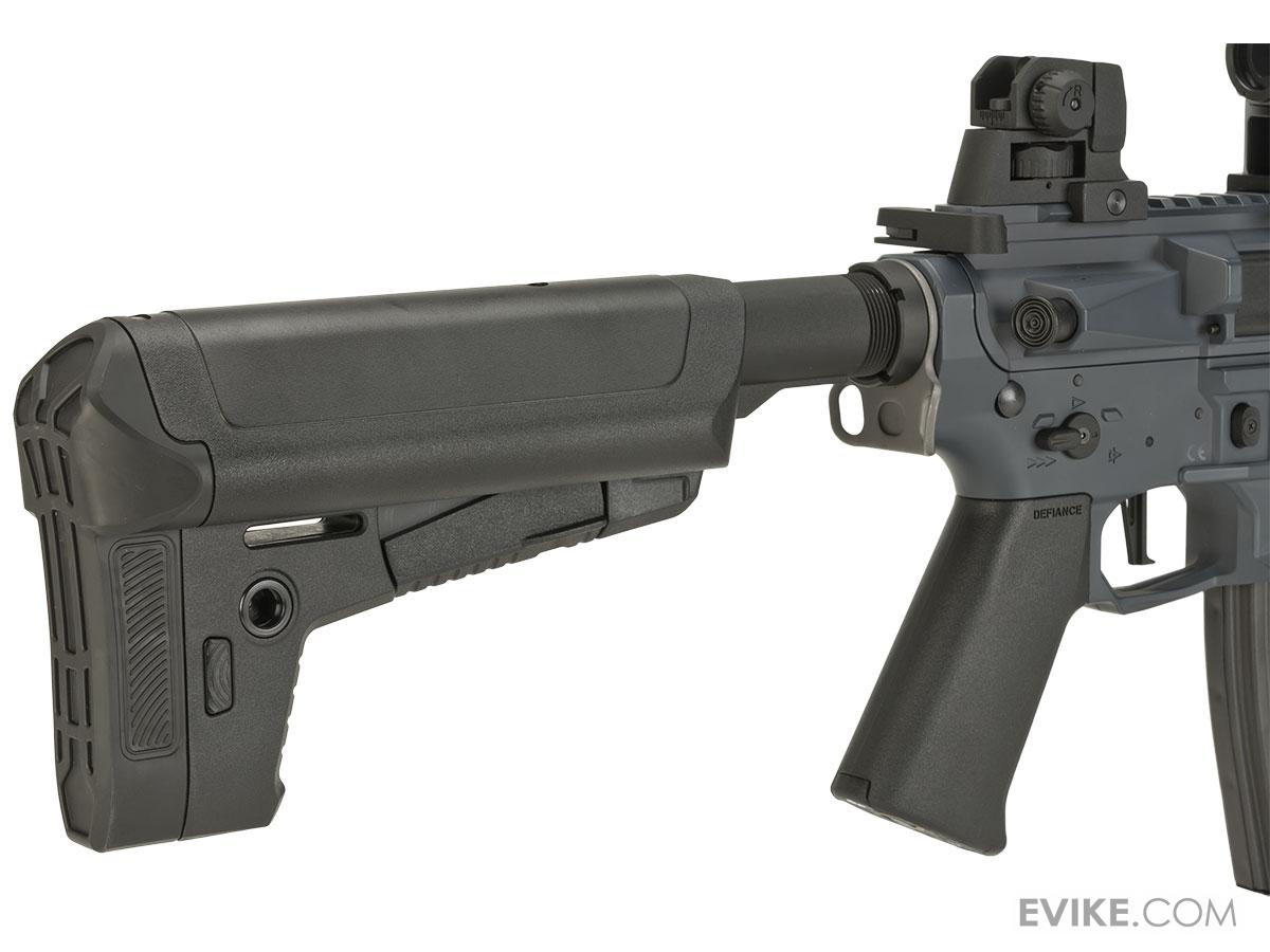 The Trident CRB is a versatile carbine length rifle that can be used effectively in close quarters battle and wide open outdoor engagements. The Trident CRB utilizes a 10.5 barrel and 10 free floating, licensed KRISS® TR110, Keymod hand guard. The KRISS® hand guard features three prongs at the front that can be used to brace the gun against barricades, eliminating the need for an aftermarket barricade stop rail accessory. The aluminum receivers feature a stamped KRYTAC logo and a dull matte black finish. Additional features include an ambidextrous fire selector and a locking bolt that provides easy access to the KRYTAC rotary hop-up system. The KRYTAC rotary hop-up has 15 adjustment settings and a numbered adjustment wheel for a quick reference point to determine how much hop is needed. The KRYTAC adjustable battery stock features two different battery configurations, nunchuck style batteries can fit in the tubes or a small lithium polymer brick battery can fit at the rear of the stock in front of the buttpad. A third battery option for the Trident CRB is a stick battery in the buffer tube. The stock also features two QD sling swivel divots as well as a loop for strap type sling attachments. The Trident CRB features the latest in shooting sports technology and it has the internals to back them up.