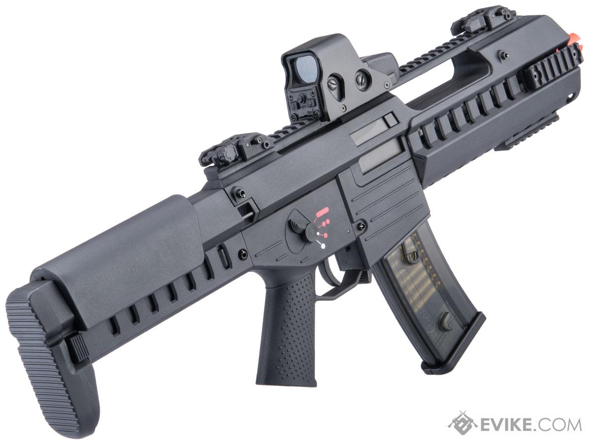 The GSG G14 is among the most technological advanced AEG rifle on the market with cutting edge internal and external features. The GSG G14 AEG features a realistic electric blowback system to simulate recoil. Additional features include an Electronic Fire Control System which helps cut down on jams / gear lock by cutting power to the gearbox when a battery approaches low voltage levels. Other features includes a 7 position retractable stock, integrated carrying handle, ambidextrous selectors, flip-up sights, functional bolt catch, integrated heat sink, quick change spring gearbox, easy take down, mock silencer / tracer unit ready, scope ready, attachments ready and much more!