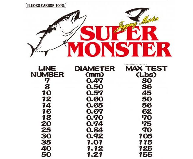 Constructed out of 100% Japanese Fluoro Carbon, the Jigging Master Super Monster Fluorocarbon lines cuts no corner and is line is the best leader line money can buy. There is a reason why Jigging Master fluorocarbon leader lines are 10~15% smaller in diameter compared to other leading brands with the same pound test rating. (JM 62 lb = 0.64mm / Seaguar 60 lb = 0.74mm / Yo-Zuri 60 lb = 0.78). The smaller diameter allows bait presentation to be natural, better knot strength, lower visibility, and ultimately yields more action! Low quality fluorocarbon lines can snap easily especially during cold temperatures, and is unreliable after a short period of time. The Jigging Master team constructed the Super Monster series fluorocarbon line by working directly with the #1 fluorocarbon line manufacture in Japan to ensure zero excuses for failure. Don't cost yourself your next trophy fish! Jigging Master work with the best of the best to bring you the best of the best when it comes to fluorocarbon leader lines!