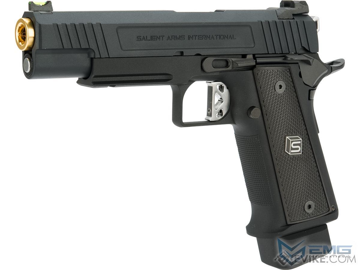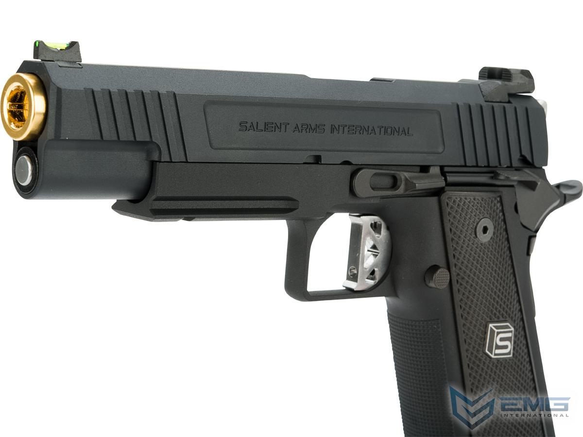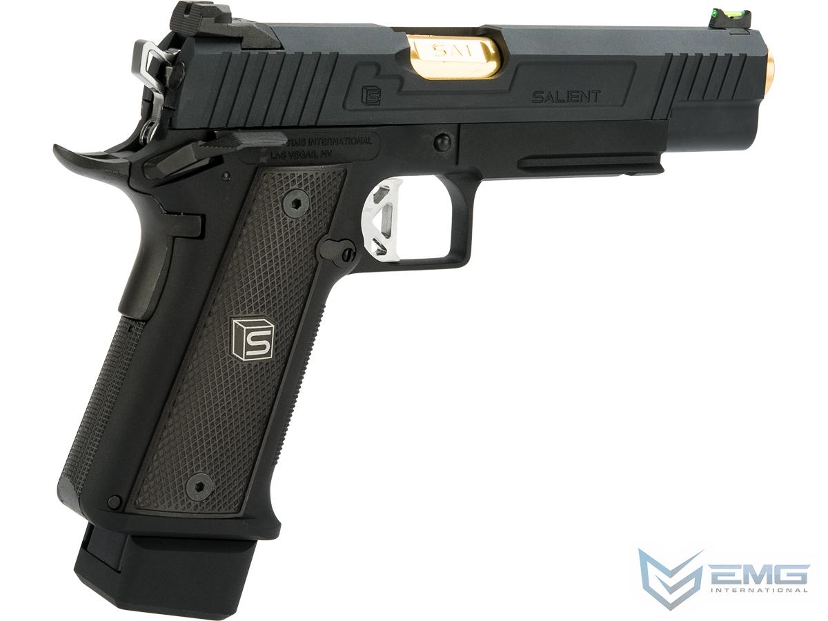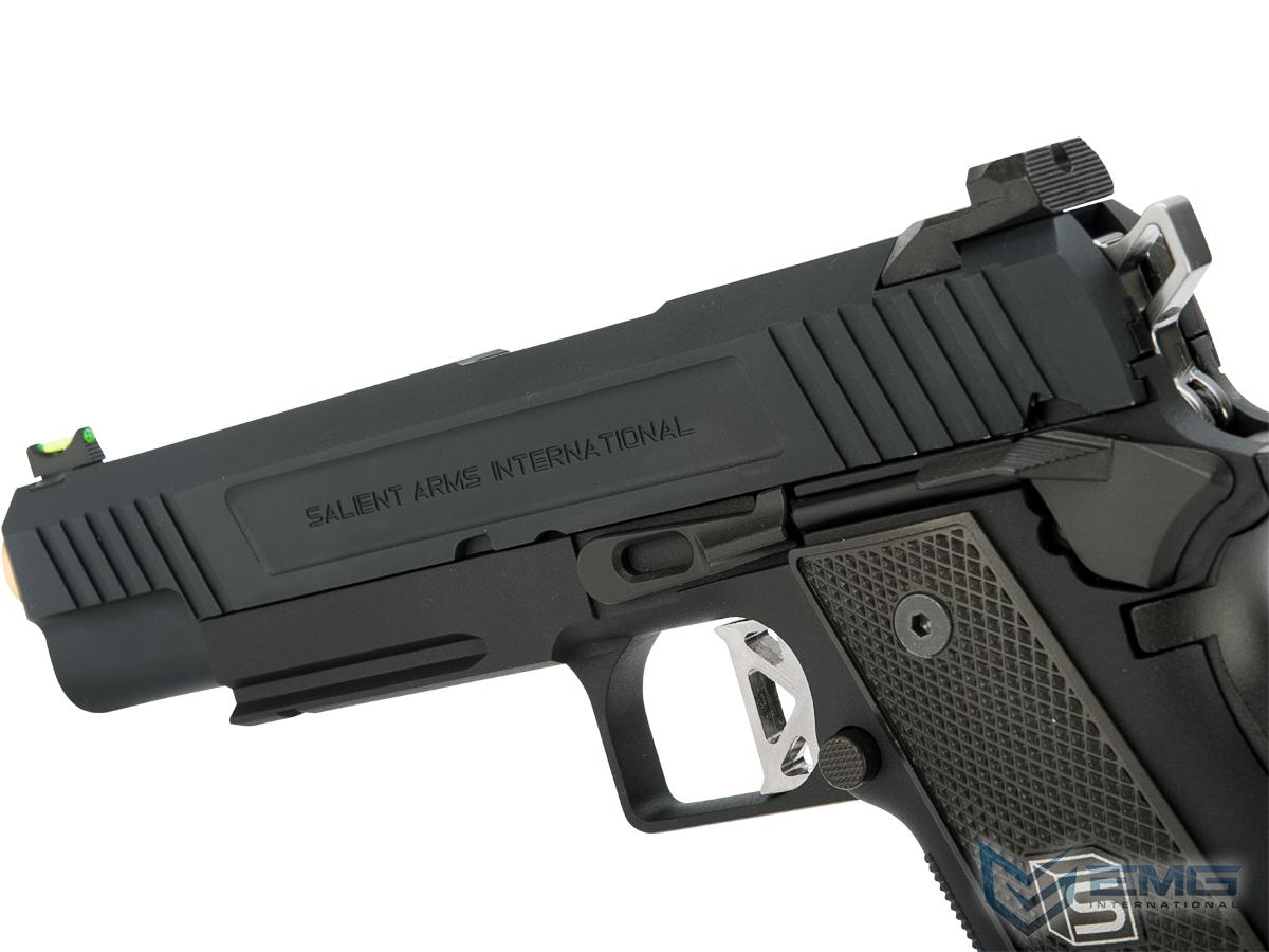 EMG has extended their collaboration with the Salient Arms and is proud to release the Salient Arms x EMG DS 2011 collaboration Airsoft Training pistol. Manufactured with an eye to detail the EMG SAI DS 2011 is CNC machined from aluminum alloy and features all of the trademarks of a Salient Arms pistol, incuding: a titanium nitride style barrel, competition style sights with fiber optic front insert, ambidextrous safety and, of course, stamped Salient Arms International rollmarks. Utilizing the Tokyo Marui Hi-Capa gas system, the Salient Arms / EMG DS pistol can be upgraded from a wide pool of available parts and components, ensuring easy repair and maintenance and years of reliable service.