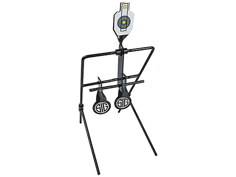 Dual shooting gallery airgun target. The all-metal pellet trap system has two center mass knockdown targets with a center SIG target for the reset function. Includes five sets of replacement target stickers.