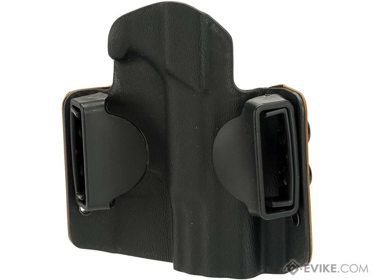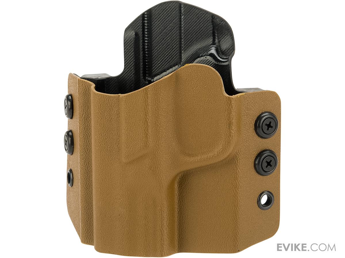 The HSGI OWB Holster securely holds your weapon of choice. Precision-molded Kydex ensures a tight grip and smooth operation, while the adjustable, curved belt loops enhance concealment and comfort. This holster includes removable adapter pieces that enable it to securely fit both 1.5 and 1.75 belts. Additionally, the minimalist cut and precision mold of each holster prevents discomfort or biting when sitting or kneeling. These holsters also feature smooth outer surfaces for safe and sleek use.