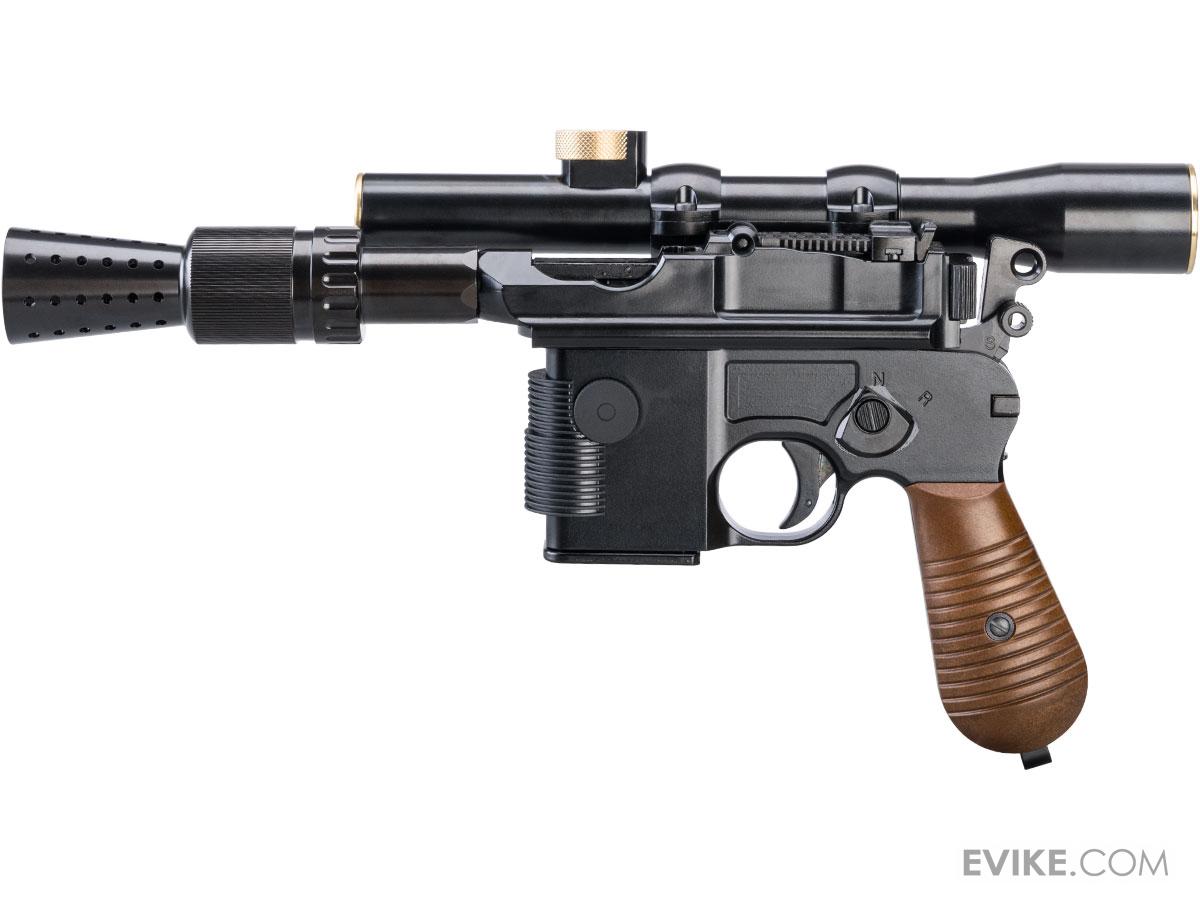 At a time when many wars were still being fought over hokey religions with ancient weapons, like spears, muskets and cannons, the Mauser Broom Handle ushered in the future of combat arms. Stripper clip or magazine fed and semi-automatic, the Mauser broom handle was like something out of a science fiction movie, when compared to other pistols of the time. The AW Custom Mauser Broom Handle custom is a unique take on the regular Mauser Broom Handle. The Armorer Works Mauser Custom has no forward sight, instead it features a side mounted scope mount and a non magnifying optic, designed to give you easy weapon indexing to draw a bead on your target whether it be in a scorched desert or a dense forest. Also setting it apart from the standard Mauser broom handle is the bolt on MG42 type amplifier style barrel sleeve, designed to give the Mauser the appearance of having a bull barrel and sound amplifier. If you are looking for a good pistol to keep by your side, there's no need to scour the universe, the AW Custom Mauser Custom Broom Handle is the pistol you are looking for. This limited edition piece will go fast so get yours before they're gone! The Mauser is a popular pistol in history as seen in many movies such as Star Wars by Han Solo!