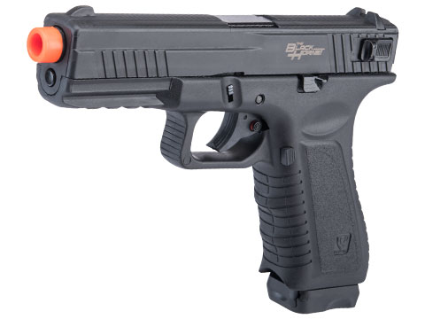 The APS Black Hornet Custom is APS's latest entry into the CO2 powered pistol market. Powered by a traditional 12g CO2 cartridge, the Black Hornet Custom features an ergonomic polymer frame with optional beveled magazine well, a polymer slide, and front and rear high visibility sights. The true gem of the Black Hornet Customs performance is its select fire, full auto capability. With the flick of the slide mounted switch the Black Hornet transforms from an extremely gas efficient semi automatic pistol to a BB spewing fully automatic monster.