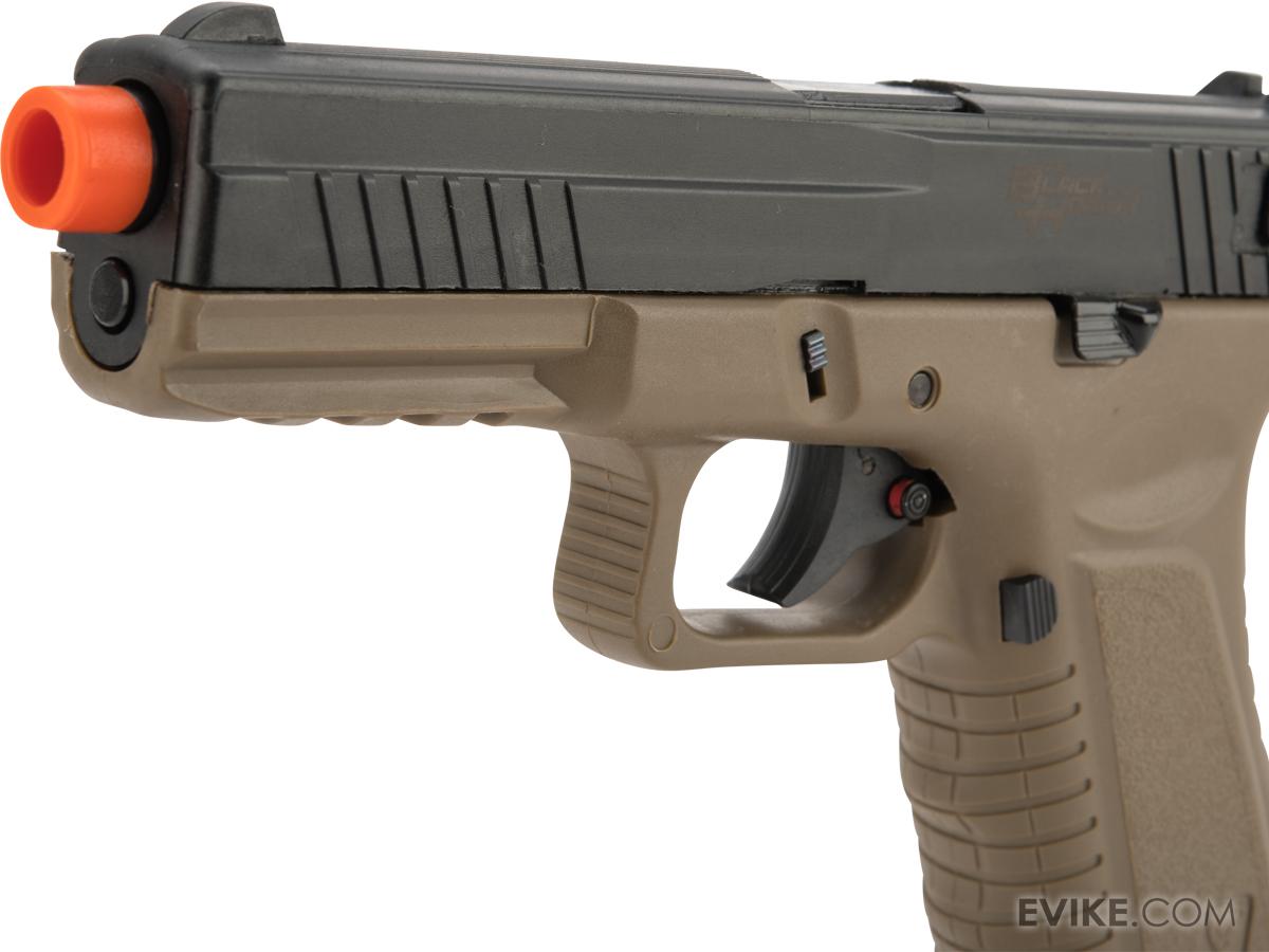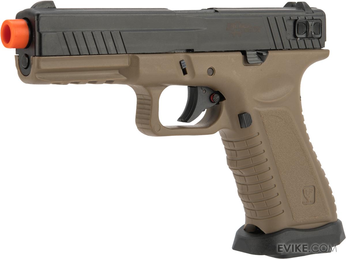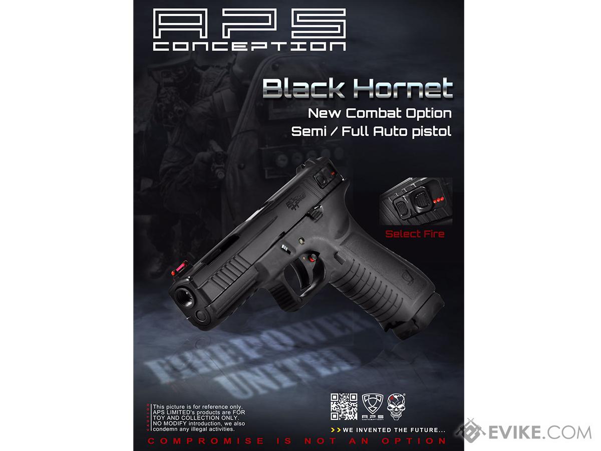 The APS Black Hornet Custom is APS's latest entry into the CO2 powered pistol market. Powered by a traditional 12g CO2 cartridge, the Black Hornet Custom features an ergonomic polymer frame with optional beveled magazine well, a polymer slide, and front and rear high visibility sights. The true gem of the Black Hornet Customs performance is its select fire, full auto capability. With the flick of the slide mounted switch the Black Hornet transforms from an extremely gas efficient semi automatic pistol to a BB spewing fully automatic monster.