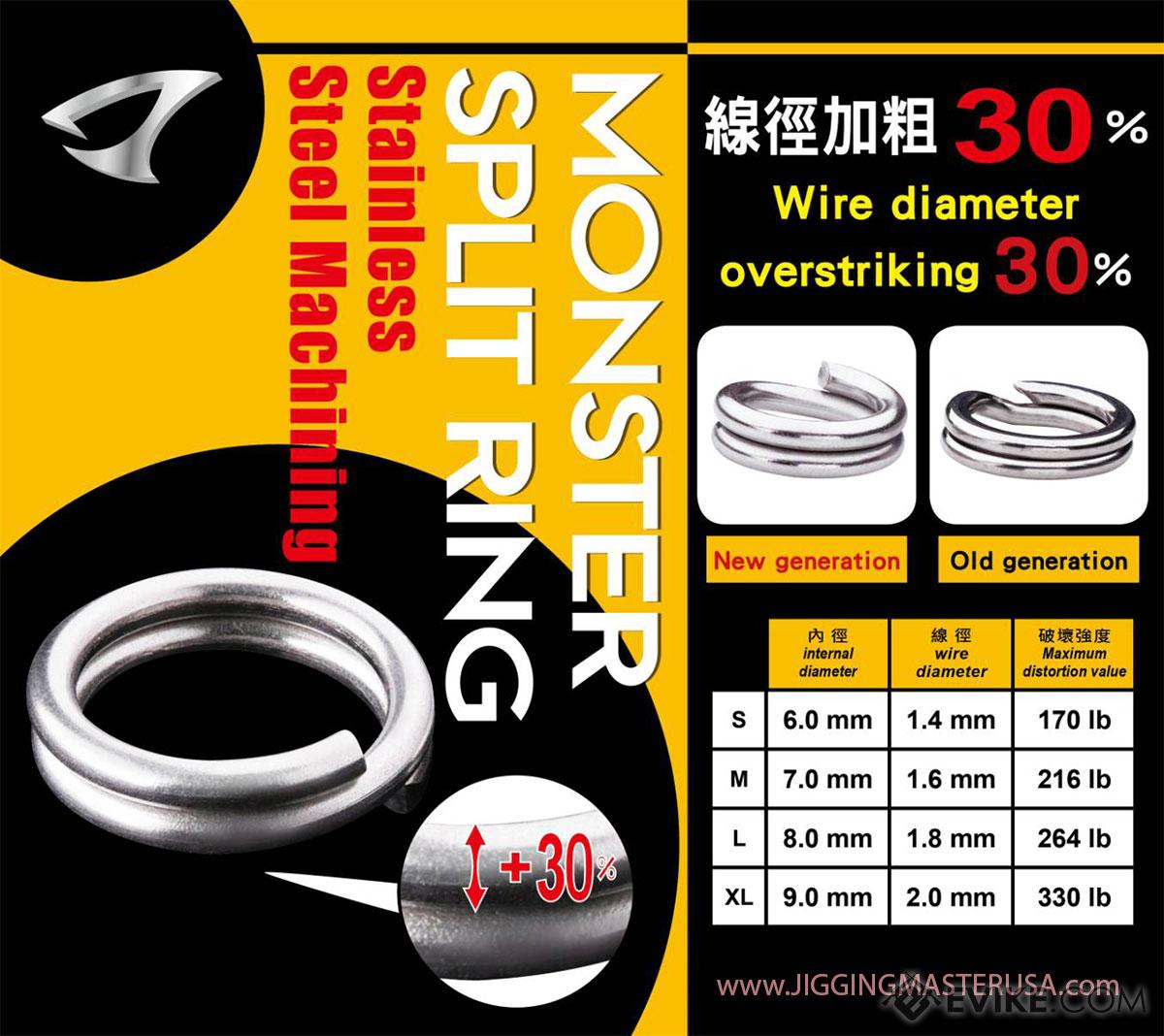 The Jigging Master Monster Split Rings are optimized split rings that returns to it's original shape after you attach the jig, is stronger than traditional split rings, and made out of high quality SUS304 stainless steel for maximum performance. The wire diameter is designed and machined with 30% overstriking diameter for that monster fight of your life time!