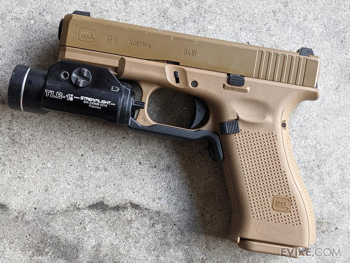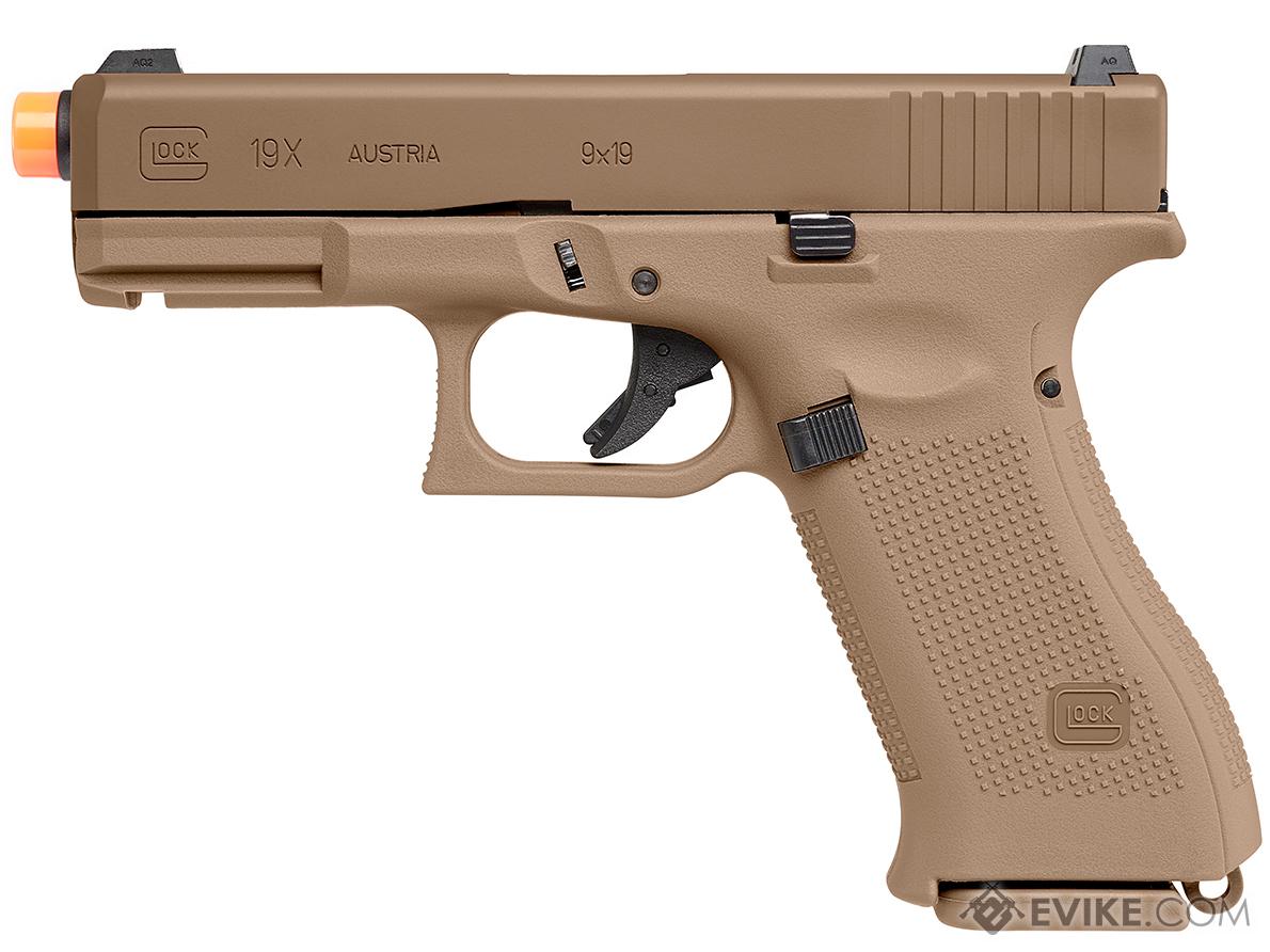 The GLOCK 19X is the first "crossover" style GLOCK pistol, combining the shorter profile of the GLOCK 19 slide with the full size frame of the GLOCK 17. Additional features include the removal of the finger grooves to better fit user's hands, comfortable grip texturing that provides a solid slip-resistant grip, and ambidextrous slide stops. The Elite Force GLOCK 19X has been modeled to be as close to the real firearm as possible so that it will feature the same holster compatibility as the real firearm as well as look and feel as close as possible to maximize training potential.