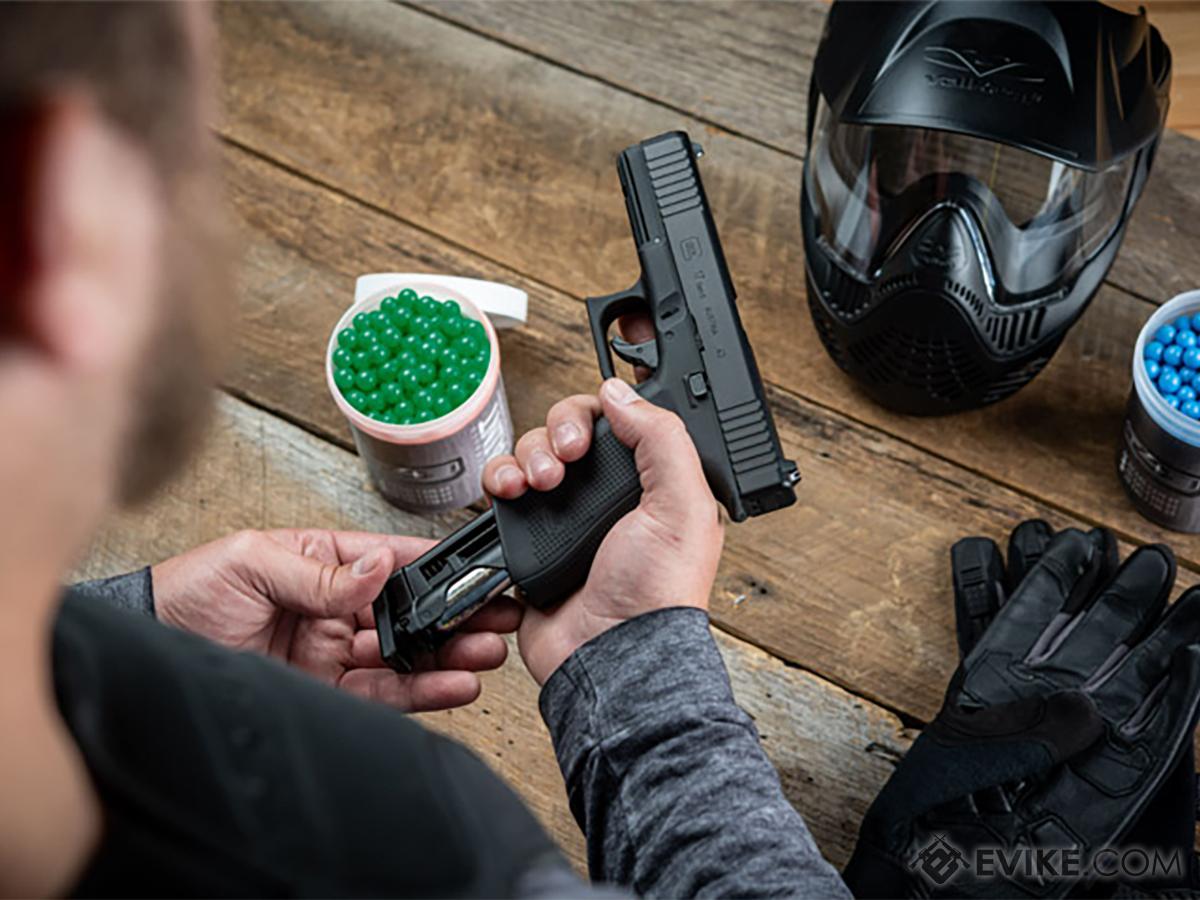 Paint. Whether used as a backup marker or operated in pistol-only mode during MagFed paintball, the GLOCK 17 Gen5 T4E is optimized to meet all the requirements of ambitious competitors. The 8-round magazine, which can hold either marking- and chalkball in caliber .43 paintball, also accommodates a 12-gram CO cartridge that can be swapped without tools in seconds on the field. Routine handling and intuitive operation are essential for accuracy. With precise dimensions, the GLOCK 17 Gen5 T4E marker gives you familiar handling and allows operators to choose from a wide range of accessories and attachments on the market its GLOCK live-fire counterpart. A quick-piercing magazine is available as an optional accessory. When you need a new cartridge, you just inert it and pierce it with a light blow at the bottom of the magazine.