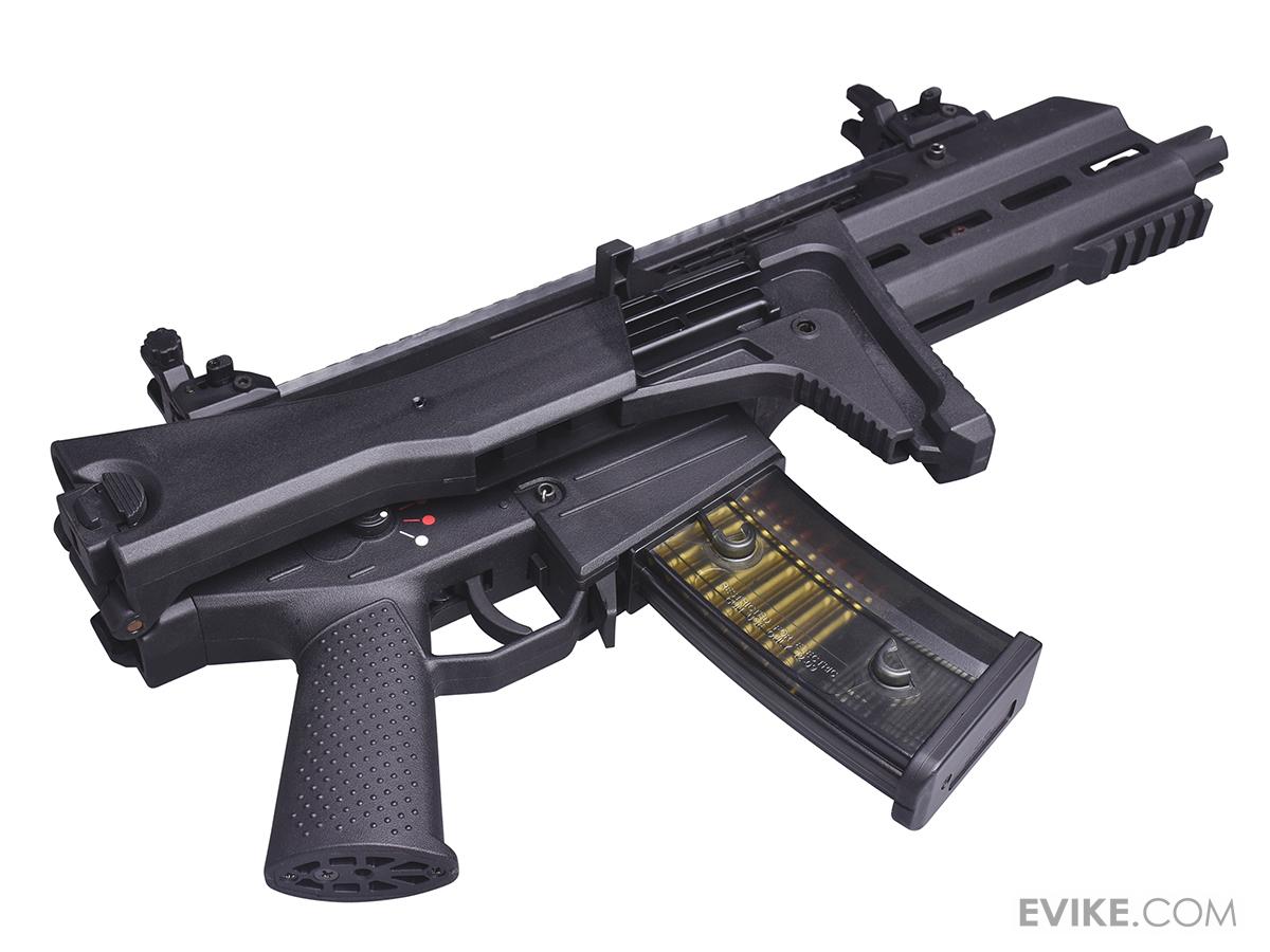 The GSG G14 is among the most technological advanced AEG rifle on the market with cutting edge internal and external features. The GSG G14 AEG features a realistic electric blowback system to simulate recoil. Additional features include an Electronic Fire Control System which helps cut down on jams / gear lock by cutting power to the gearbox when a battery approaches low voltage levels. Other features includes a 7 position retractable stock, integrated carrying handle, ambidextrous selectors, flip-up sights, functional bolt catch, integrated heat sink, quick change spring gearbox, easy take down, mock silencer / tracer unit ready, scope ready, attachments ready and much more!